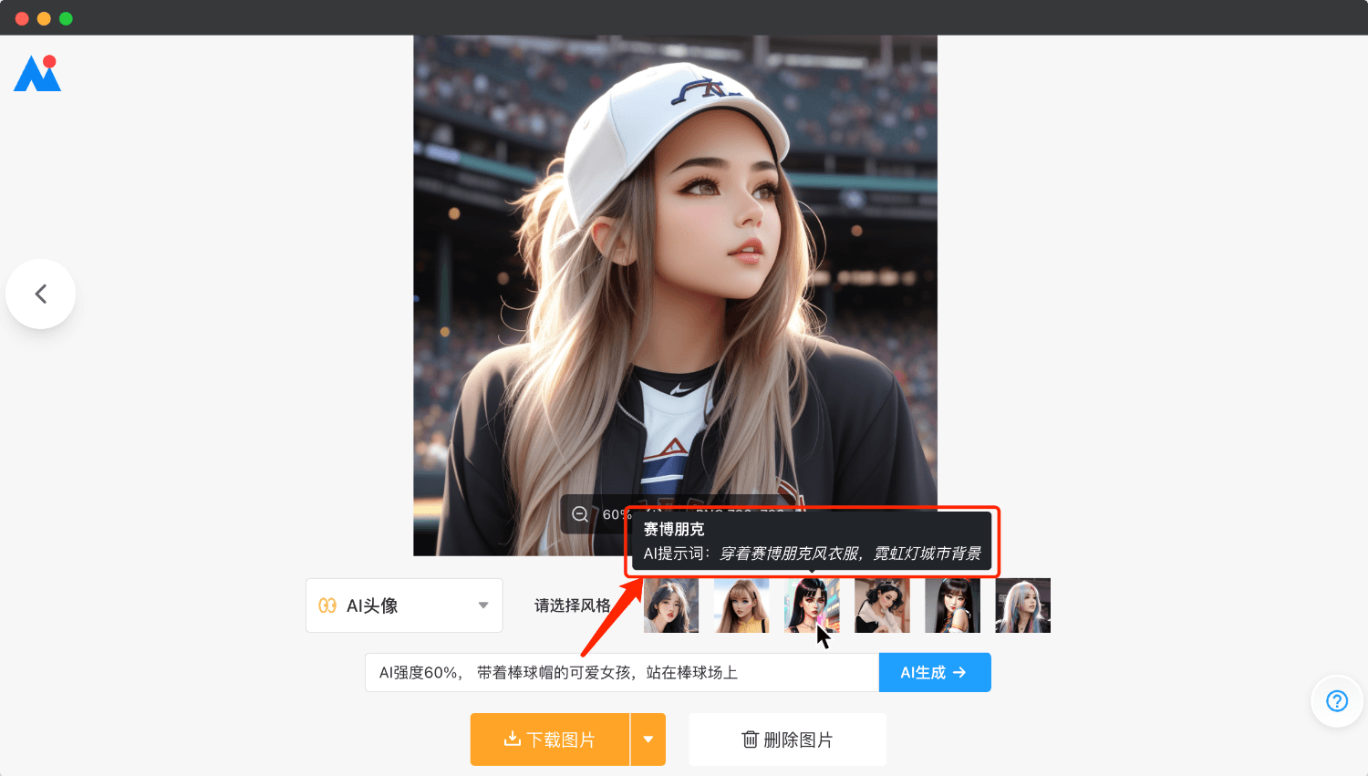 比如我们就可以按照【人物特征+图片背景】的提示词格式,在下方输入框中输入【带着棒球帽的可爱女孩,站在棒球场上】,点击AI生成即可,按照这个格式书写AI指令我们就可以轻松生成不同风格的动漫头像了,而且是完全独一无二的哦!